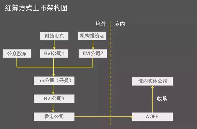 現(xiàn)今中國企業(yè)一般是以H/N股形式或紅籌形式在海外市場上市。H/N股形式是指中國注冊的企業(yè)經(jīng)相關(guān)部門和中國證監(jiān)會審批,組建在中國注冊的股份有限公司,申請發(fā)行H/N股上市。中國證監(jiān)會對H股上市政策上較為支持,需時較短,手續(xù)較直接,也不需要為搭建海外架構(gòu)而進(jìn)行大量的公司重組。可是H股上市實體為中國注冊的股份有限公司,未來公司在股份轉(zhuǎn)讓或其他企業(yè)行為方面,受國內(nèi)法規(guī)的限制較多,而且全流通目前還僅在有限的試點進(jìn)行。紅籌形式上市則是指境內(nèi)企業(yè)的實際控制人在境外注冊離岸公司,之后通過該離岸公司所設(shè)立的境內(nèi)全資子公司(以下簡稱WOFE)返程收購自己在境內(nèi)的實體企業(yè),再以離岸公司為平臺實現(xiàn)境外融資或上巿。紅籌形式上巿最大的好處是股票全流通,資金管理較有彈性。但是于2006年,商務(wù)部、國務(wù)院國有資產(chǎn)監(jiān)督管理委員會、國家稅務(wù)總局、中國證監(jiān)會、國家工商行政管理總局及國家外匯管理局共同頒布《關(guān)于外國投資者并購境內(nèi)企業(yè)的規(guī)定》(10號文),當(dāng)中規(guī)定境內(nèi)公司,企業(yè)或自然人以其在境外合法設(shè)立或控制的公司名義并購與其有關(guān)聯(lián)關(guān)系的境內(nèi)公司,應(yīng)報商務(wù)部審批。該規(guī)定成為境內(nèi)企業(yè)或自然人搭建紅籌架構(gòu)的重大障礙。大家可以參照以下一個基礎(chǔ)的紅籌架構(gòu):