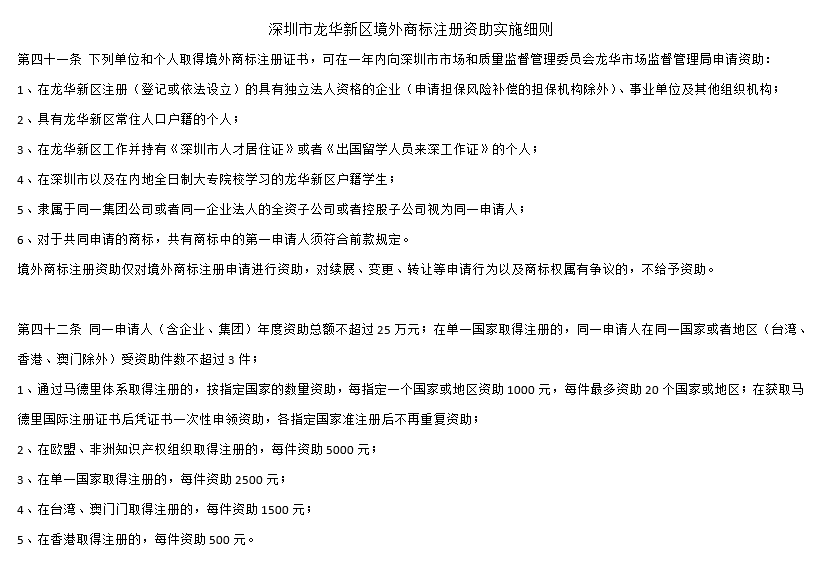 根據(jù)深圳市龍華新區(qū)境外商標(biāo)注冊資助實施細(xì)則第42條