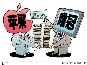 2000年,深圳唯冠科技有限公司在中國內(nèi)地注冊“iPad”商標(biāo),2010年底,蘋果公司訴請確定“iPad”商標(biāo)權(quán)屬,2011年11月17日,深圳中院一審判決駁回蘋果訴訟請求,“iPad”商標(biāo)歸屬深圳唯冠。2012年2月17日,惠州市中級法院已經(jīng)判當(dāng)?shù)靥O果經(jīng)銷商構(gòu)成侵權(quán),禁止其銷售蘋果iPad香港產(chǎn)品,這是國內(nèi)法院首次認(rèn)定蘋果商標(biāo)侵權(quán)。經(jīng)過長時間的訴訟歷程,蘋果和唯冠最終達(dá)成和解,蘋果支付給唯冠6000萬美元,同事獲得在中國注冊“iPad”商標(biāo)。