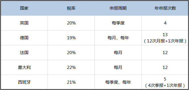歐盟5國(英德法意西)增值稅(VAT)稅率及申報周期對照表: