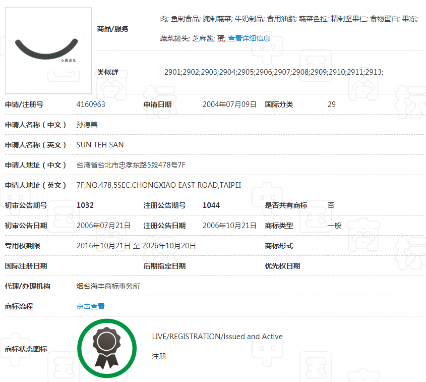 例如成語“心滿意足”注冊在第44類,指定商品\服務(wù)為“按摩; 保健; 公共衛(wèi)生浴; 理發(fā)店; 美容師服務(wù); 美容院; 桑拿浴服務(wù); 心理專家; 蒸氣浴;”等類別上的時候,被駁回了。但是當(dāng)注冊29類,指定使用在“肉; 魚制食品; 腌制蔬菜; 牛奶制品; 食用油脂; 蔬菜色拉; 精制堅果仁; 食物蛋白; 果凍; 蔬菜罐頭; 芝麻醬; 蛋; ”時,則被成功注冊。