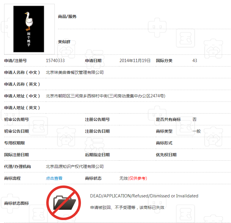 由北京味美曲香餐飲管理有限公司(即本案申請人)于2014年11月19日提出注冊申請“叫個鴨子及圖”商標(以下稱申請商標),指定使用在第43類“住所代理(旅館、供膳寄宿處)、烹飪設備出租”等服務上。后經(jīng)審查,以申請商標標識文字部分使用在指定服務項目上,直接表示了該服務的內(nèi)容等特點,并易造成不良社會影響,不得作為商標使用,違反了《商標法》第十條第一款第(八)項的規(guī)定為由駁回其注冊申請。2016年6月7日,申請人不服上述駁回決定,依法提出駁回復審