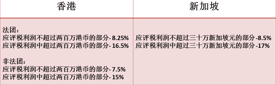 由上述可看出,對(duì)于新成立的利潤(rùn)額較?。◣资f(wàn))的小微型企業(yè),新加坡的稅率更具有競(jìng)爭(zhēng)優(yōu)勢(shì),而對(duì)于盈利較大的中大型企業(yè),兩個(gè)地區(qū)在稅收上相差并不大。