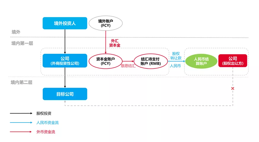 圖二 外商投資性公司利用外匯結(jié)匯資金在境內(nèi)開(kāi)展股權(quán)并購(gòu)資金流路徑