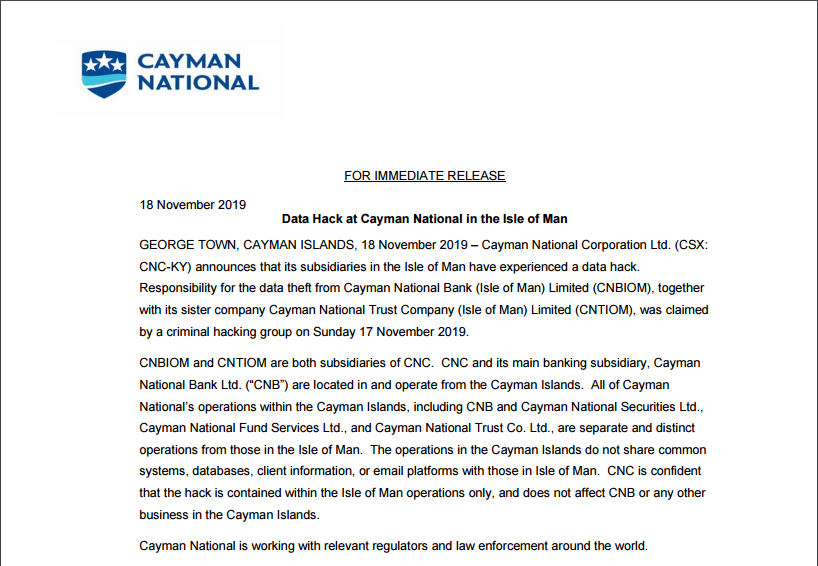 針對此次數(shù)據(jù)嚴(yán)重泄露事件,11月18日,開曼國家銀行公開發(fā)布一份聲明,證實(shí)其數(shù)據(jù)信息遭到入侵: