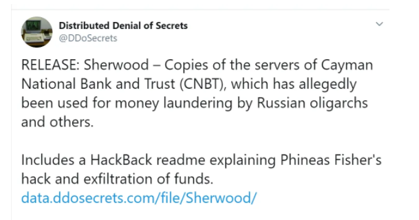 事件還要回到上周五(11月15日),一自稱PhineasFisher的黑客或黑客組織公開發(fā)表了一份宣言。宣言稱,他們已經(jīng)入侵了開曼國家銀行(Cayman National Bank)竊取了數(shù)十萬美元,并高調(diào)地表示在數(shù)字時(shí)代搶劫銀行是一種非暴力、低風(fēng)險(xiǎn)、高回報(bào)的行動(dòng)。隨后,該黑客還通過網(wǎng)站 Distributed Denial of Secrets(以下簡稱“DDoS”) 公開了從開曼國家銀行竊取到的 2.21 TB數(shù)據(jù)。