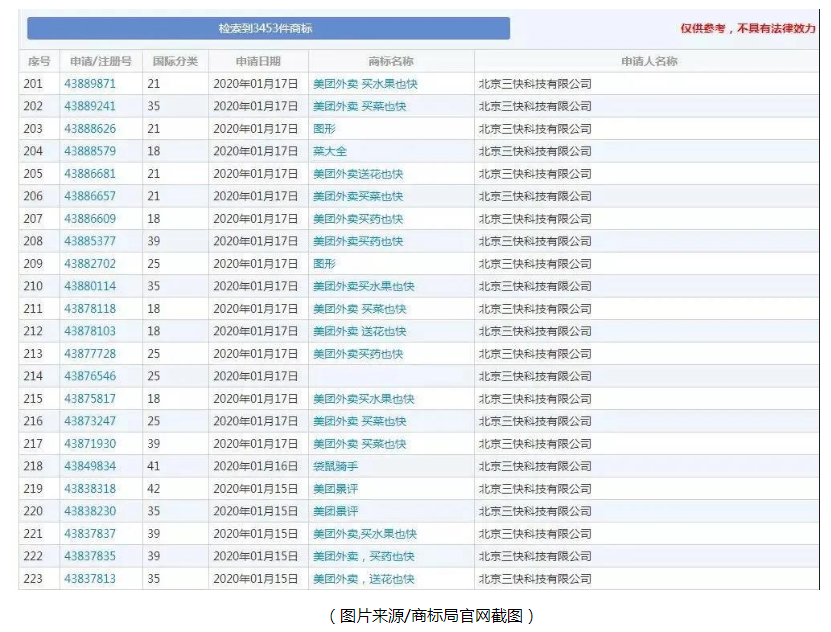 美團(tuán)“一口氣”注冊(cè)近40件生鮮商標(biāo):近日,美團(tuán)申請(qǐng)了幾枚有關(guān)生鮮業(yè)務(wù)的商標(biāo),美團(tuán)外賣買藥也快;美團(tuán)外賣買菜也快;美團(tuán)外賣買水果也快;美團(tuán)外賣送花也快;美團(tuán)外賣送啥都快;美團(tuán)外賣無(wú)接觸安心送……此外,中國(guó)商標(biāo)局顯示,美團(tuán)又提交了百余件商標(biāo)申請(qǐng),但具體商標(biāo)名稱不得而知,但很有可能與“線上生鮮”相關(guān)。2020年,受疫情影響,生鮮電商異軍突起,中國(guó)生鮮電商整體日活用戶從平日的800萬(wàn),在春節(jié)期間突破1000萬(wàn),節(jié)后再次突破1200萬(wàn),增幅高達(dá)60%。