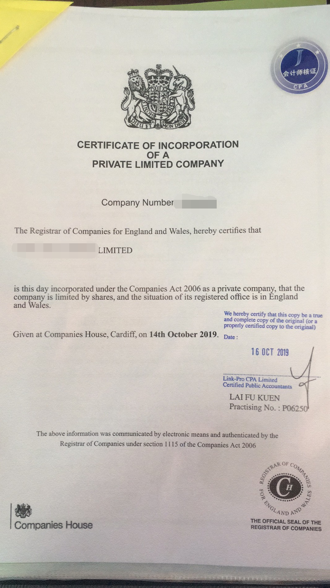 1.英國公司的注冊(cè)證書;