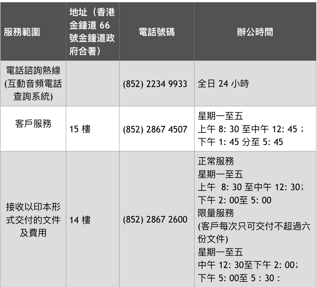 為減少社交接觸以減低疫情在社區(qū)傳播的風(fēng)險(xiǎn),市民應(yīng)盡量避免前往該署的辦事處。 如須送交文件至該署,市民可使用該署設(shè)于金鐘道政府合署高座大堂樓層的指定寄存辦理箱。 市民亦可使用該署的電子服務(wù)及透過以下方法聯(lián)絡(luò)該署: