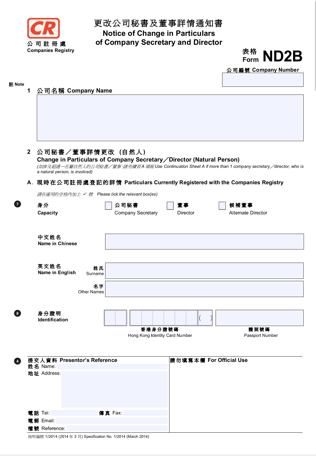 表格 ND4: 公司秘書及董事辭職通知書 Notice of Resignation of Secretary and Director 表格ND2A: 更改公司秘書及董事通知書(委任/停任) Notice of Change of Company Sec答