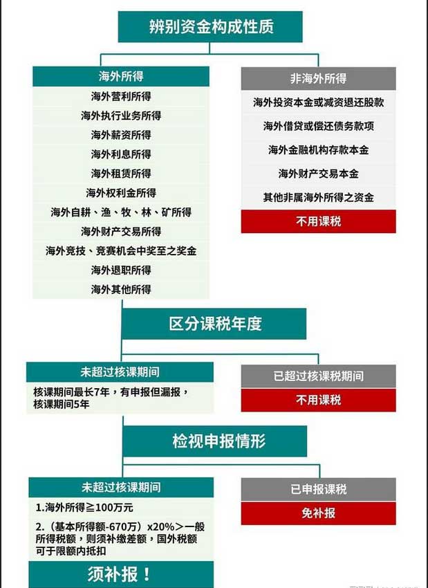 在臺(tái)灣地區(qū)內(nèi)有住所并為常住人口,或在臺(tái)灣地區(qū)內(nèi)無住所,但于一個(gè)課稅年度內(nèi)在臺(tái)灣地區(qū)居留合計(jì)滿183天者,滿足以上條件之一的人群均需將海外所得納入基本所得額。 如下圖所示三個(gè)步驟明白匯回的海外資金是否課稅: