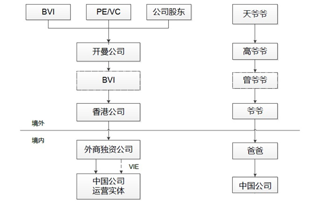 那讓咱們來仔細(xì)梳理梳理紅籌上市過程中這些洋祖宗公司和它們各自的作用。紅籌上市一般的架構(gòu)為BVI公司(可以有,天爺爺)+開曼公司(作為上市實(shí)體,必須有,高爺爺)+BVI公司(可以有,非必須,曾爺爺)+香港公司(爺爺)+外商獨(dú)資企業(yè)(Wholly Owned Foreign Enterprise,“WOFE”,爸爸)+境內(nèi)運(yùn)營(yíng)實(shí)體(中國(guó)公司)。