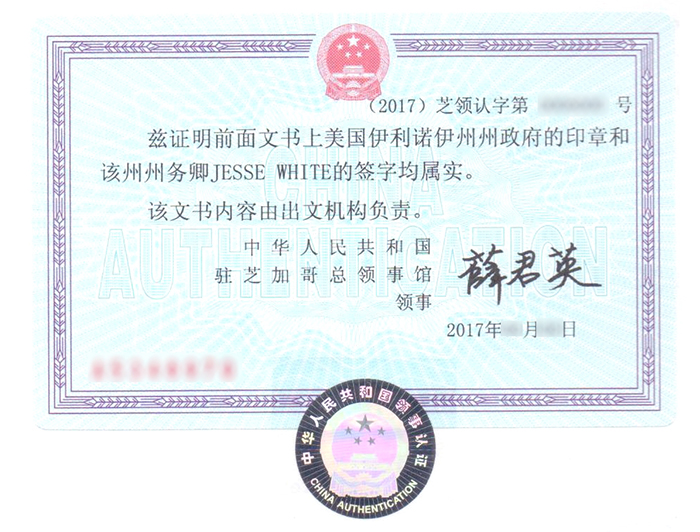 ——中國(guó)領(lǐng)事館再在州務(wù)卿認(rèn)證頁的背面貼個(gè)單面膠來證明州務(wù)卿的印章及官員某某某的簽字是真的,然后蓋章。