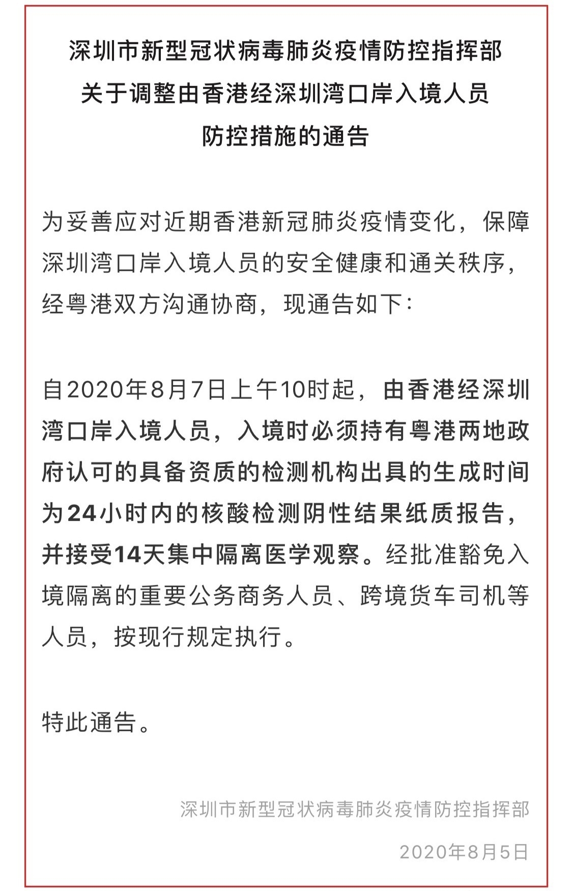 自2020年8月7日上午10時(shí)起,由香港經(jīng)深圳灣口岸入境人員,入境時(shí)必須持有粵港兩地政府認(rèn)可的具備資質(zhì)的檢測(cè)機(jī)構(gòu)出具的生成時(shí)間為24小時(shí)內(nèi)的核酸檢測(cè)陰性結(jié)果紙質(zhì)報(bào)告,并接受14天集中隔離醫(yī)學(xué)觀察。經(jīng)批準(zhǔn)豁免入境隔離的重要公務(wù)商務(wù)人員、跨境貨車(chē)司機(jī)等人員,按現(xiàn)行規(guī)定執(zhí)行。特此通告。