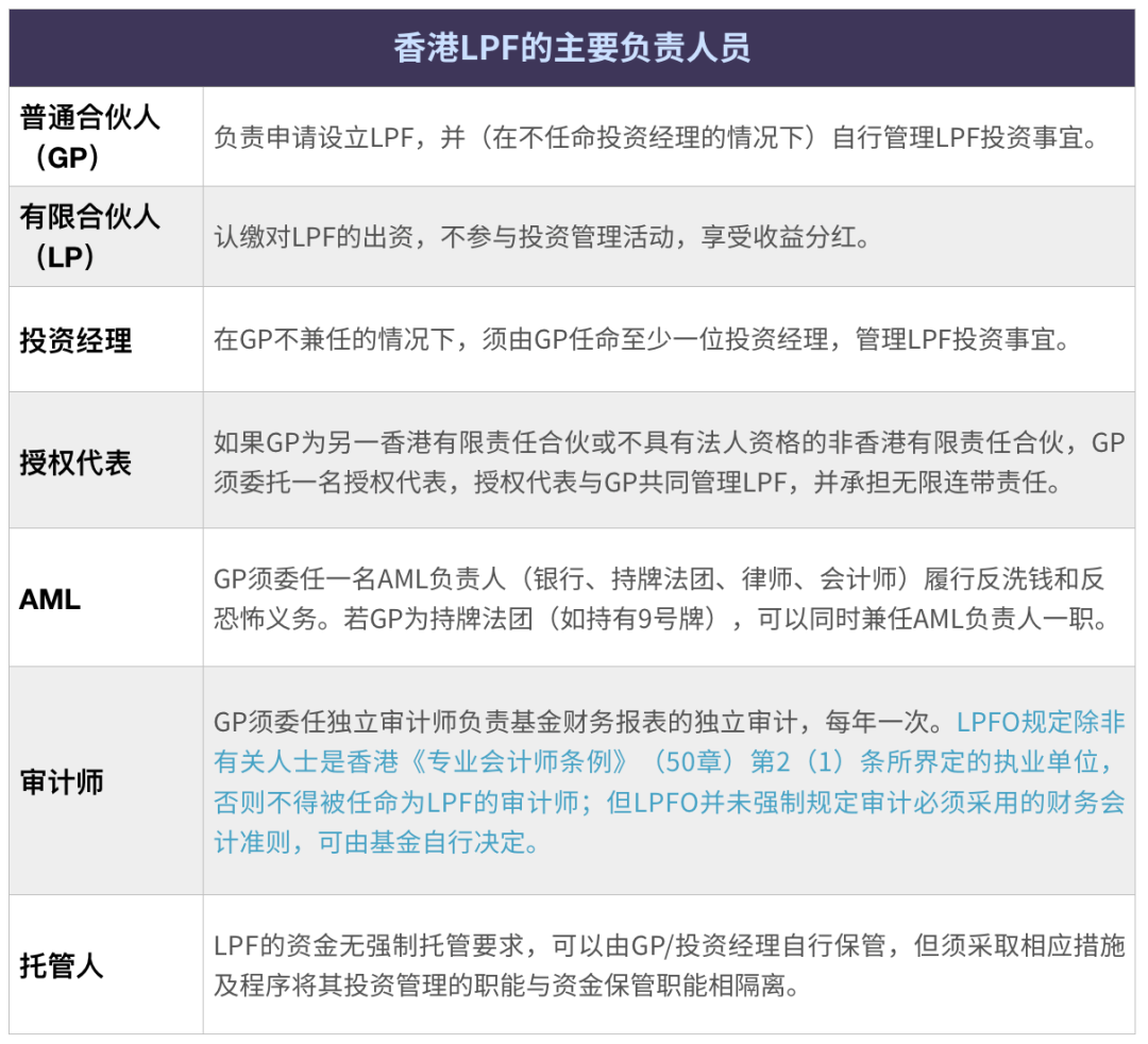 根據(jù)香港LPFO,LPF的定義與開曼群島、新加坡采用有限合伙制的私募基金含義基本一致。在一個(gè)典型的香港LPF中,其運(yùn)營(yíng)至少需要涉及到普通合伙人(GP)、有限合伙人(LP)、投資經(jīng)理、授權(quán)代表、AML【1】、審計(jì)師、托管人等重要負(fù)責(zé)人員,基本要求如下表所示: