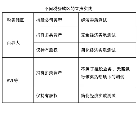 根據(jù)該意見(jiàn)書(shū)的答復(fù),似乎會(huì)得出一個(gè)令人疑惑的初步結(jié)論,即BVI公司在僅持有公司股權(quán)的情形下需要進(jìn)行“控股業(yè)務(wù)”的經(jīng)濟(jì)實(shí)質(zhì)測(cè)試,在此基礎(chǔ)上另行投資其他類型的資產(chǎn)(如政府債券、房產(chǎn)等)反而不再屬于從事“控股業(yè)務(wù)”,也無(wú)需接受“控股業(yè)務(wù)”的經(jīng)濟(jì)測(cè)試,如果公司也未從事其他類型的“相關(guān)活動(dòng)”,即可不再受《經(jīng)濟(jì)實(shí)質(zhì)法案》的約束。如果該初步結(jié)論能夠成立,未來(lái)其他擬上市公司存在BVI控股架構(gòu)也能夠采取類似的方式免于《經(jīng)濟(jì)實(shí)質(zhì)法》的規(guī)制。這樣的理解是否合適?在其他稅務(wù)轄區(qū)的經(jīng)濟(jì)實(shí)質(zhì)法體系下是否也有類似的規(guī)避方式?
