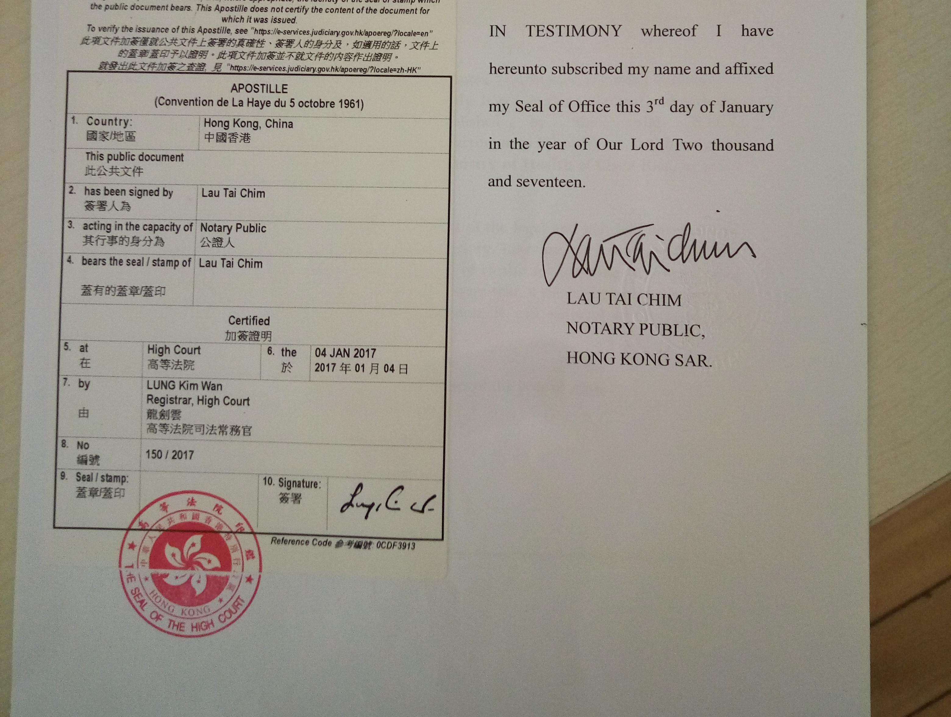 2、再由香港國際公證人轉(zhuǎn)遞香港高院認(rèn)證,并加蓋apostille專用章。