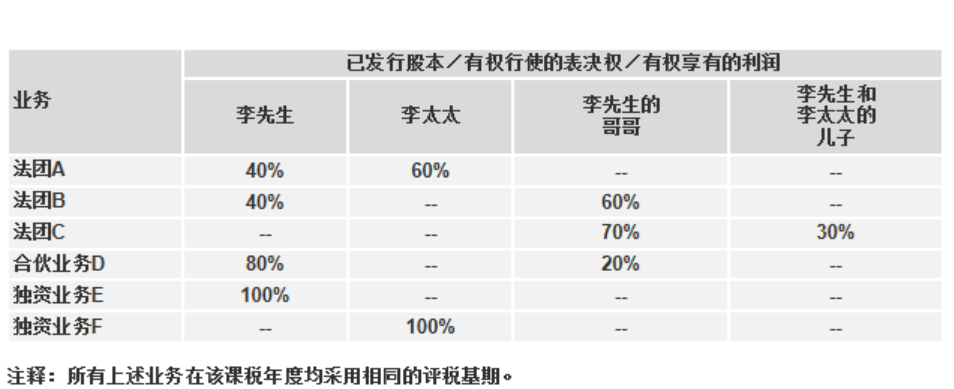 李先生和他的家庭成員擁有以下業(yè)務(wù): 合伙業(yè)務(wù)D和獨(dú)資業(yè)務(wù)E屬有關(guān)連實(shí)體,原因是它們均受李先生的控制。只有合伙業(yè)務(wù)D或獨(dú)資業(yè)務(wù)E其中之一可以在其合伙業(yè)務(wù)的利得稅報(bào)稅表內(nèi)或在李先生的個(gè)別人士報(bào)稅表內(nèi)選擇按兩級(jí)制利得稅率課稅。