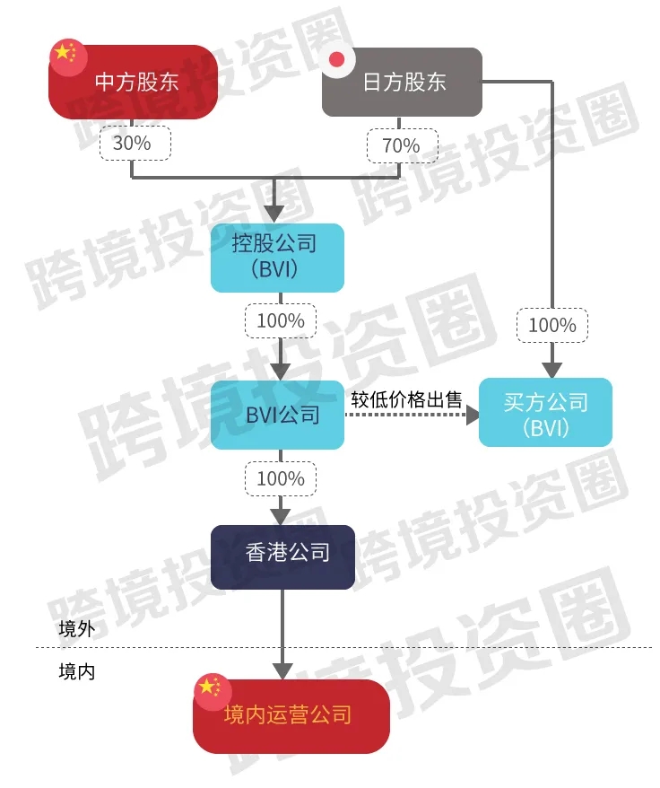 日方股東作為控股公司的唯一董事,將控股公司持有的BVI公司全部股份轉(zhuǎn)讓給日方股東獨(dú)資的另一家由日方股東100%控股的BVI公司(以下簡(jiǎn)稱買方公司)。在確定轉(zhuǎn)讓價(jià)格時(shí),日方股東“強(qiáng)烈建議”評(píng)估公司采用估值較低的資產(chǎn)法(估值約730萬(wàn)元)而非估值較高的未來(lái)現(xiàn)金流量貼現(xiàn)法(估值約2,600萬(wàn)元)。最終,控股公司以較低的價(jià)格將BVI公司的全部股份轉(zhuǎn)讓給了買方公司。
