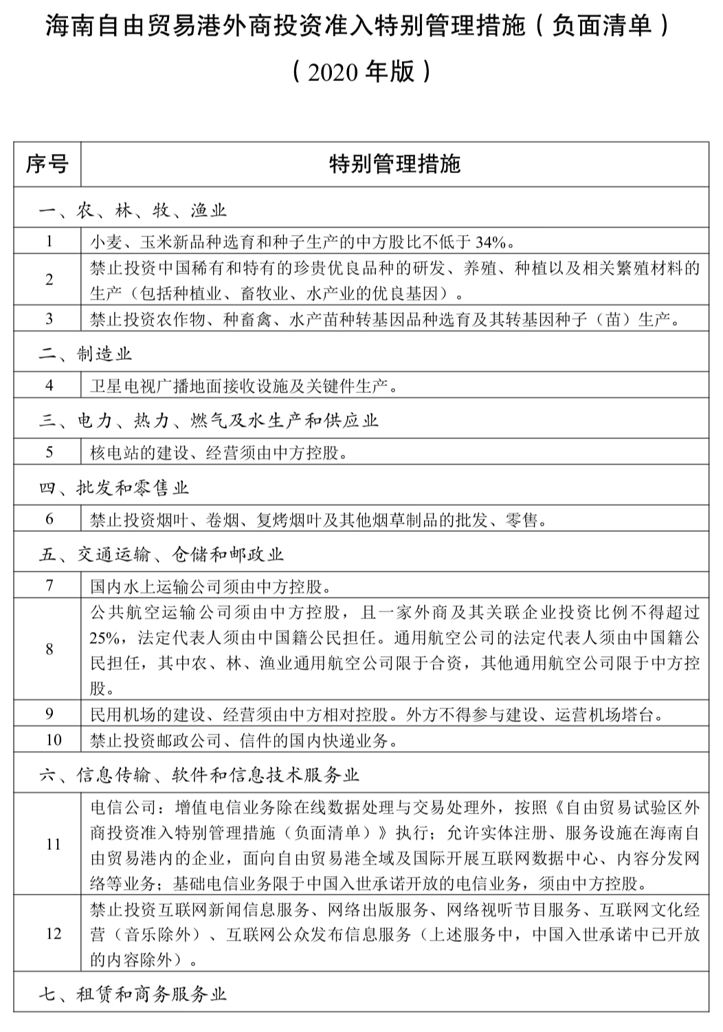 《海南自由貿(mào)易港外商投資準(zhǔn)入特別管理措施(負(fù)面清單)》全文