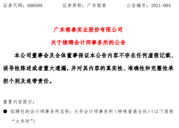 而廣東榕泰雖然指責審計師大華所時毫不留情,卻并未因此而辭退對方,而是在不久后發(fā)布公告稱續(xù)聘這家“未能勤勉盡責的”會計師事務(wù)所。續(xù)聘公告如下: