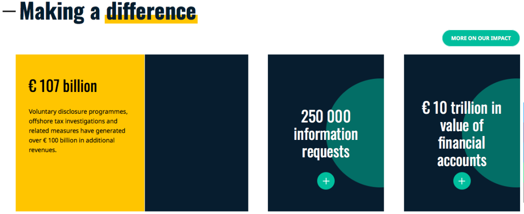 — 這一切指向的都是稅務(wù)透明,說白了也就是“征稅”。正如OECD所顯示的那樣,通過海量數(shù)據(jù)的賬戶信息交換,自動(dòng)信息交換機(jī)制已經(jīng)為各國稅務(wù)部門創(chuàng)造出了上億歐元的稅收收入。通過離岸賬戶隱匿信息來避稅的傳統(tǒng)做法,再也無法行通了。