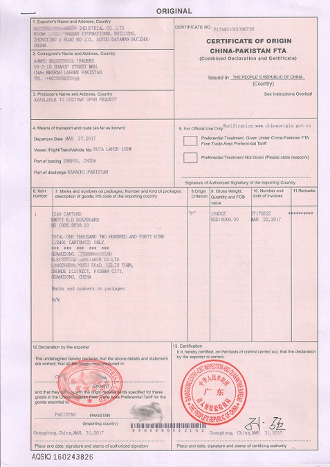 中國(guó)—巴基斯坦自貿(mào)區(qū)協(xié)議-原產(chǎn)地證書(shū),此證書(shū)只允許貨物出口到巴基斯坦國(guó)家時(shí)候才可以簽證。證書(shū)英文名稱(chēng):《CERTIFICATE OF ORIGIN CHINA-PAKISTAN FTA》,簡(jiǎn)稱(chēng)“中巴證書(shū)”。簽證產(chǎn)品 《中國(guó)—巴基斯坦自由貿(mào)易區(qū)優(yōu)惠原產(chǎn)地證書(shū)》的簽發(fā),限于已公布的《協(xié)定》項(xiàng)下給予關(guān)稅優(yōu)惠的產(chǎn)品,這些產(chǎn)品必須符合《中國(guó)—巴基斯坦自由貿(mào)易區(qū)原產(chǎn)地規(guī)則》。證書(shū)文字內(nèi)容以英文填寫(xiě)。
