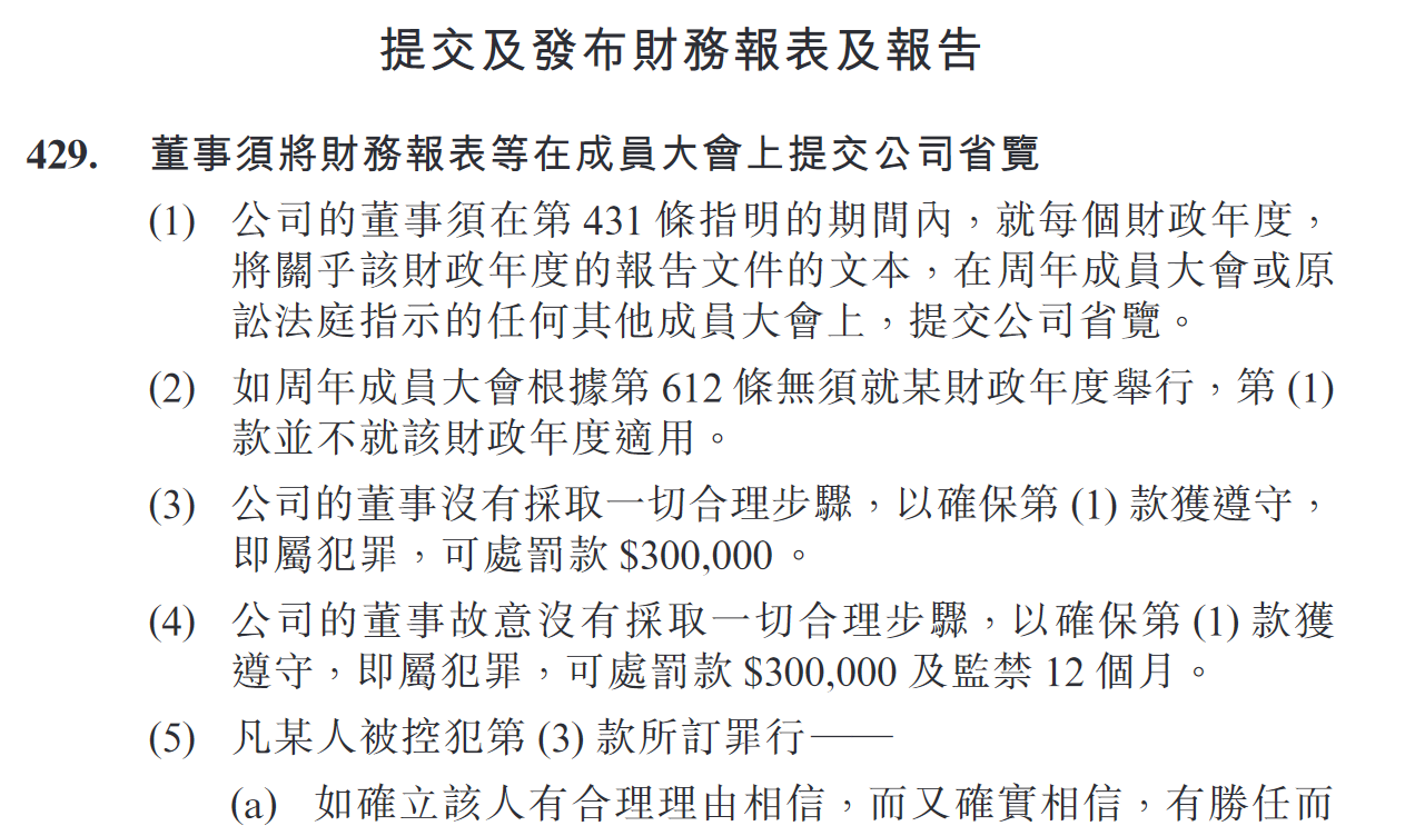 第429條. 董事須將財務(wù)報表等在成員大會上提交公司省覽(1)公司的董事須在第431條指明的期間內(nèi),就每個財政年度,將關(guān)乎該財政年度的報告文件的文本,在周年成員大會或原訟法庭指示的任何其他成員大會上,提交公司省覽。