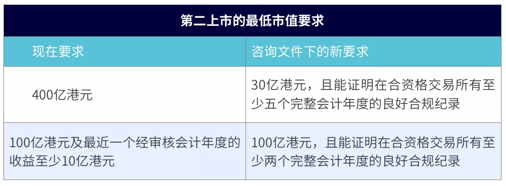 根據咨詢文件,未來海外發(fā)行人到香港第二上市的最低市值要求將會降低,具體如下: