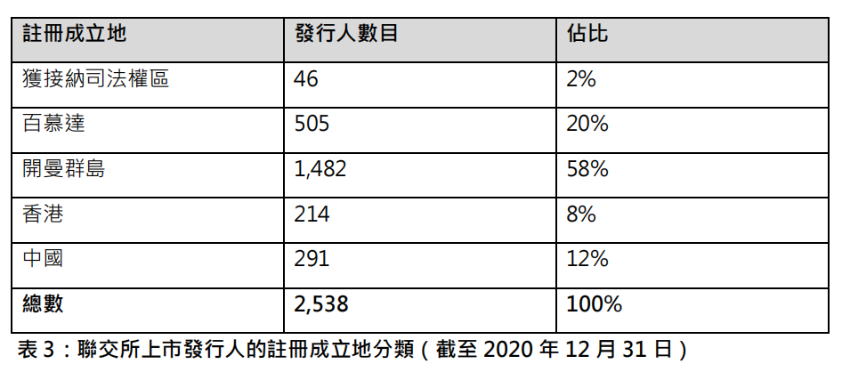 ? 值得注意的是,根據咨詢文件披露,在聯交所上市發(fā)行人的注冊成立地分類統計中,截至12月31日,百慕大、開曼群島、香港和中國的發(fā)行人數目為2492家,所占比例高達98%,其他20多個獲接納司法管轄區(qū),比如BVI、澤西島等,發(fā)行人數目總計僅46,占比為2%,幾乎可忽略不計。