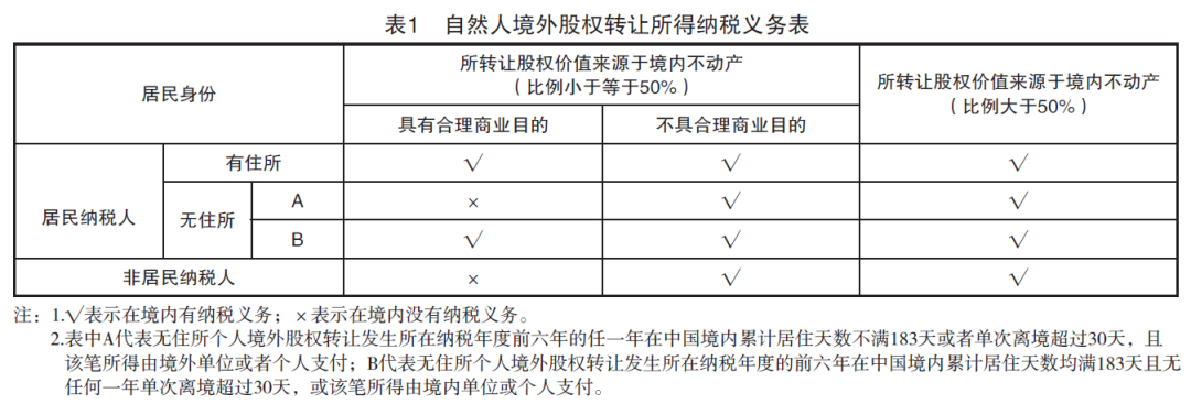 作為非居民,其僅就來源于中國境內(nèi)的所得申報繳納個人所得稅。境外股權轉讓所得在大多數(shù)情況下被認定為來源中國境外的所得,在中國免予繳納個人所得稅,但有兩種情況除外:一是根據(jù)3號公告第一條第七款的規(guī)定,境外被轉讓股權公允價值50%以上直接或間接來自于位于中國的不動產(chǎn),符合此條件的境外股權轉讓所得將被直接認定為來源于中國境內(nèi)的所得,應向中國稅務機關申報繳納個人所得稅;二是通過不具有合理商業(yè)目的安排獲取不當稅收利益,被中國稅收機關進行納稅調(diào)整。如《中華人民共和國政府和新加坡共和國政府關于對所得避免雙重征稅和防止偷漏稅的協(xié)定》在第十三條第五款中約定,一方居民轉讓締約國另一方居民公司股權行為發(fā)生前十二個月內(nèi)曾直接或間接參與該公司至少25%資本,可在該締約國另一方征稅。雖該轉讓行為一般是指非居民納稅人直接轉讓中國公司股權,但如果其通過不具有合理商業(yè)目的的安排間接轉讓中國公司股權,則中國稅務機關有權啟動反避稅調(diào)查程序,進行反避稅調(diào)查。經(jīng)歸納,自然人境外股權轉讓所得納稅義務詳見表1。