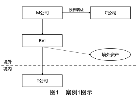 - 案例1(見圖1):M公司(境外公司)持有BVI公司(境外公司)100%的股權(quán),BVI公司持有T公司(境內(nèi)公司)100%的股權(quán),同時BVI公司還持有其他境外資產(chǎn)。M公司將其持有的BVI公司100%的股權(quán)轉(zhuǎn)讓給C公司(境外公司),從而間接轉(zhuǎn)讓T公司(境內(nèi)公司)的股權(quán)。
