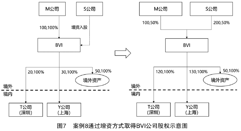 案例8(見圖7):假設(shè)M公司初始投資100萬元設(shè)立BVI公司,BVI公司用其中50萬元投資境外資產(chǎn),20萬元投資成立境內(nèi)深圳公司T,30萬元投資成立境內(nèi)上海公司Y。2年后,境外資產(chǎn)和境內(nèi)T公司、Y公司都增值了1倍。因此,BVI公司的公允價值從100萬元變?yōu)榱?00萬元。此時,S公司希望取得BVI公司50%的股權(quán),直接向BVI公司增資200萬元,取得了BVI公司50%的股權(quán)。BVI公司取得S公司增值的200萬元后,分別用其中的100萬元增加對深圳T公司投資,100萬元增加對上海Y公司投資。