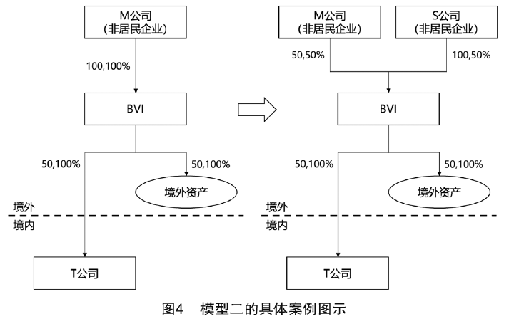 案例5(見圖4):假設(shè)原先非居民企業(yè)M公司以100萬元投資成立BVI公司,BVI公司用50萬元投資境外資產(chǎn),50萬元設(shè)立境內(nèi)T公司。之后,境內(nèi)T公司和境外資產(chǎn)都產(chǎn)生了1倍的增值,BVI公司股權(quán)的公允價值從100萬元變?yōu)?00萬元。此時,M公司轉(zhuǎn)讓50%的股權(quán)給S公司,轉(zhuǎn)讓價格是100萬元。S公司取得BVI股權(quán)的計稅基礎(chǔ)就是100萬元。