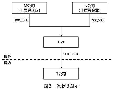 案例3(見圖3):M公司投資100萬元成立BVI公司,BVI公司用100萬元成立境內(nèi)T公司,之后N公司增資400萬元到BVI公司,占BVI公司50%的股份。而BVI公司用取得的400萬元繼續(xù)增加對境內(nèi)T公司投資。
