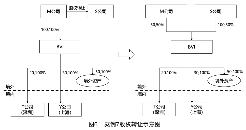 案例7(見圖6):案例基本背景同上,M公司、BVI公司、S公司均為境外公司,T公司(深圳)、Y公司(上海)均為境內(nèi)公司。