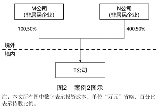 案例2(見圖2):再以一個直接持股的案子為例。假設(shè)非居民企業(yè)M公司和N公司分別都持有境內(nèi)T公司50%的股權(quán),M公司是原始股股東,成本假設(shè)是100萬元。而N公司是后期增資進來的,成本假設(shè)是400萬元。如果這兩家公司此時同時轉(zhuǎn)讓T公司股權(quán),計算各自的應(yīng)納稅所得額時,雖然其轉(zhuǎn)讓收入都是一樣的,但各自扣除的成本是不一樣的,M公司扣除100萬元,N公司扣除400萬元。