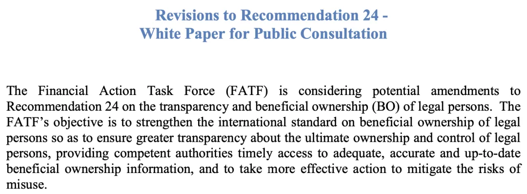 除了更新黑名單和灰名單外,F(xiàn)ATF還將對法人實體實益所有人(Beneficial Owner,“BO”)信息透明化使出“新招數(shù)”——修訂Recomendation 24。對此,F(xiàn)ATF發(fā)布了最新的修訂白皮書。白皮書中,F(xiàn)ATF認為在環(huán)境犯罪和腐敗犯罪中,很多掛名公司(front companies)被用來掩蓋犯罪行為。因此,公司實益所有人信息的透明度對阻止犯罪分子將非法行為隱藏在復(fù)雜的公司架構(gòu)后至關(guān)重要。