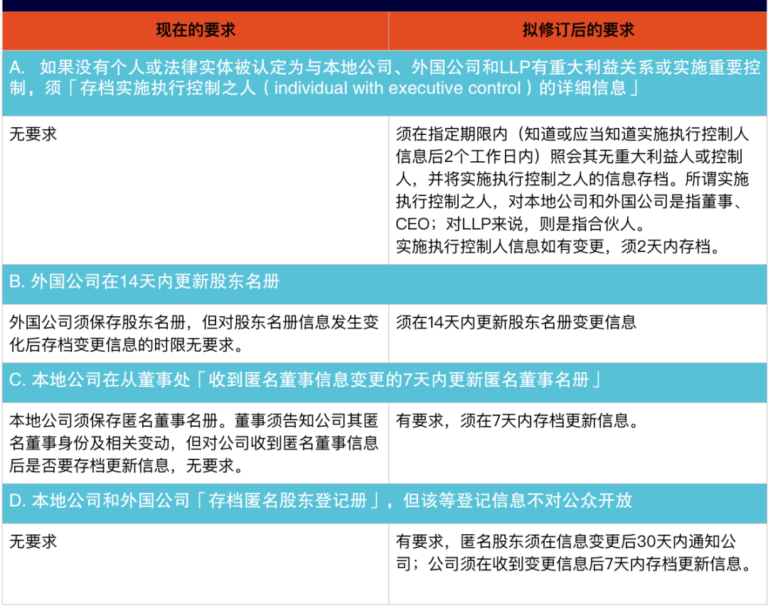 - 如果沒有個(gè)人或法律實(shí)體被認(rèn)定為與本地公司、外國公司和LLP有重大利益關(guān)系或?qū)嵤┲匾刂?,則要求本地公司、外國公司和LLP在“控制人登記冊(cè)”中「存檔實(shí)施執(zhí)行控制之人(individual with executive control)的詳細(xì)信息」;