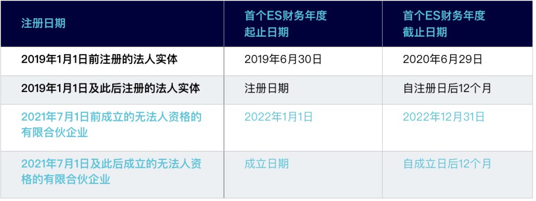 國際稅務局對注冊于不同時期的BVI公司或LPs經(jīng)濟實質的首個財務年度和截止日期做了如下劃分: