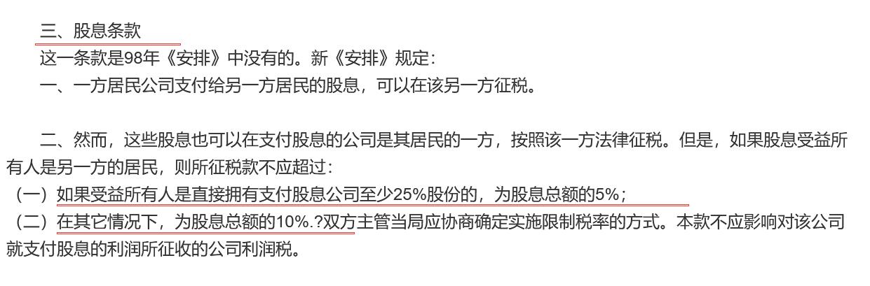 香港公司獲得內地投資企業(yè)股息分紅可能適用《內地和香港特別行政區(qū)關于對所得避免雙重征稅和防止偷漏稅的安排》有關股息的條款,1.一方居民公司支付給另一方居民的股息,可以在另一方征稅。2.然而,這些股息也可以在支付股息的公司是其居民的一方,按照該一方法律征稅。但是,如果股息受益所有人是另一方的居民,則所征稅款不應超過如下要求,即如果受益所有人是直接擁有支付股息公司至少25%股份的,為股息總額的5%。在其他情況下(股份低于25%),為股息總額的10%。雙方主管當局應協(xié)商確定實施限制稅率的方式。本款不應影響對該公司就支付股息的利潤所征收的公司利潤稅。