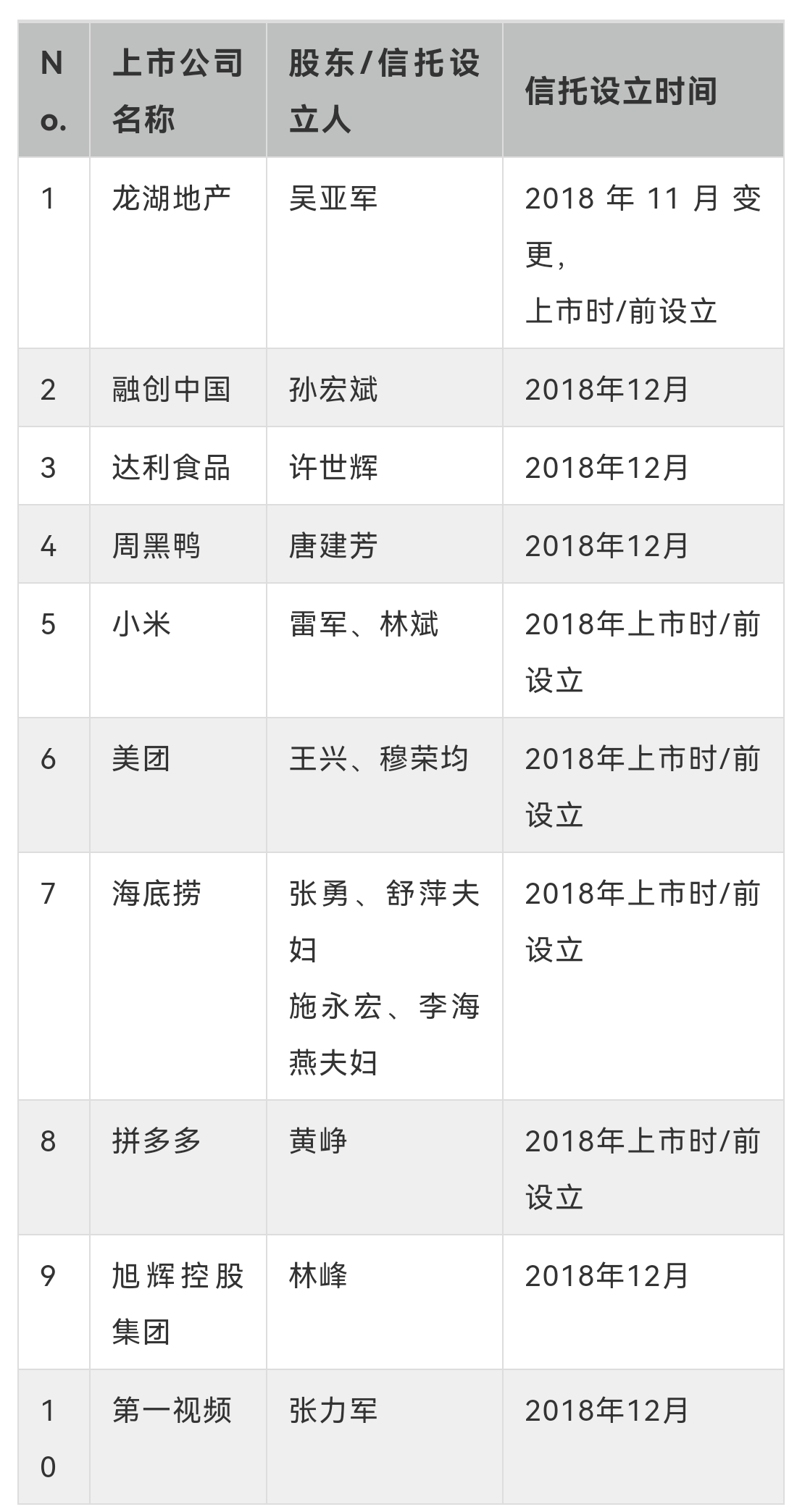 可以說,該客戶對離岸架構(gòu)和離岸信托已經(jīng)有了一定的了解,否則不會直接提出設立離岸信托進行財富傳承這樣的需求。事實上,這可能并不是該客戶的先見之明,而是高凈值人士目前的一種“潮流”之選。據(jù)坊間傳聞,僅僅在2018年最后兩個月,中國內(nèi)地高凈值人士成立/變更了300多個海外家族信托。比如,著名的小米、美團、龍湖地產(chǎn)、海底撈、融創(chuàng)中國、周黑鴨等(見下表)??梢钥闯?,現(xiàn)階段很多中國內(nèi)地高凈值人士在將境外資產(chǎn)從“個人-離岸公司”轉(zhuǎn)移到“離岸信托-離岸公司”架構(gòu)中。