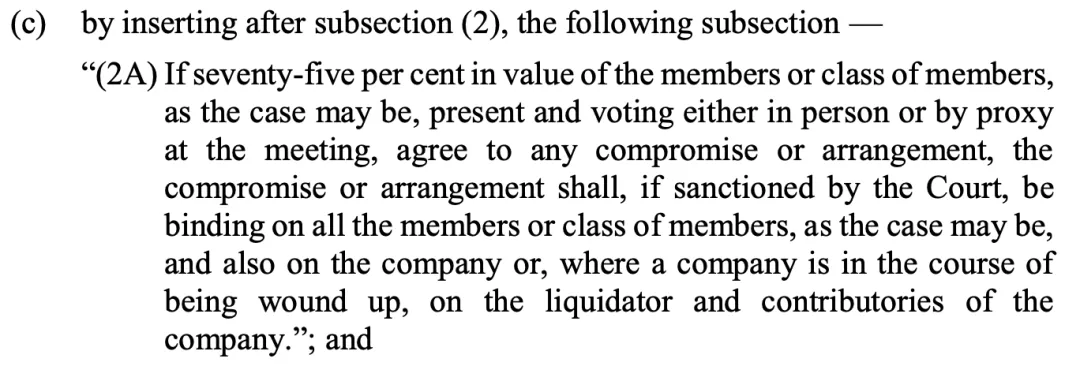 《公司法》(2021年修訂)新增的第86(2A)條將適用于股東協(xié)議,其規(guī)定:“若持有股份面值不少于75%的股東或類(lèi)別股東(視情況而定)親自(或委派代表)出席會(huì)議并投票贊成任何和解或安排,則該和解或安排一經(jīng)法院批準(zhǔn),即對(duì)所有股東或類(lèi)別股東(視情況而定)具有約束力,且亦對(duì)公司(倘公司正在進(jìn)行清盤(pán),則對(duì)清盤(pán)人和出資人)具有約束力?!?br />