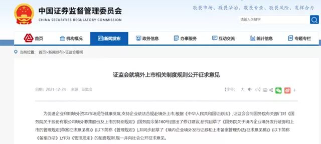 12月24日,中國證監(jiān)會發(fā)布了《國務(wù)院關(guān)于境內(nèi)企業(yè)境外發(fā)行證券和上市的管理規(guī)定(草案征求意見稿)》(以下簡稱《管理規(guī)定》)和《境內(nèi)企業(yè)境外發(fā)行證券和上市備案管理辦法(征求意見稿)》(以下簡稱《備案辦法》)【1】,明確VIE架構(gòu)企業(yè)在合法合規(guī)并完成備案的前提下可以申請境外上市。