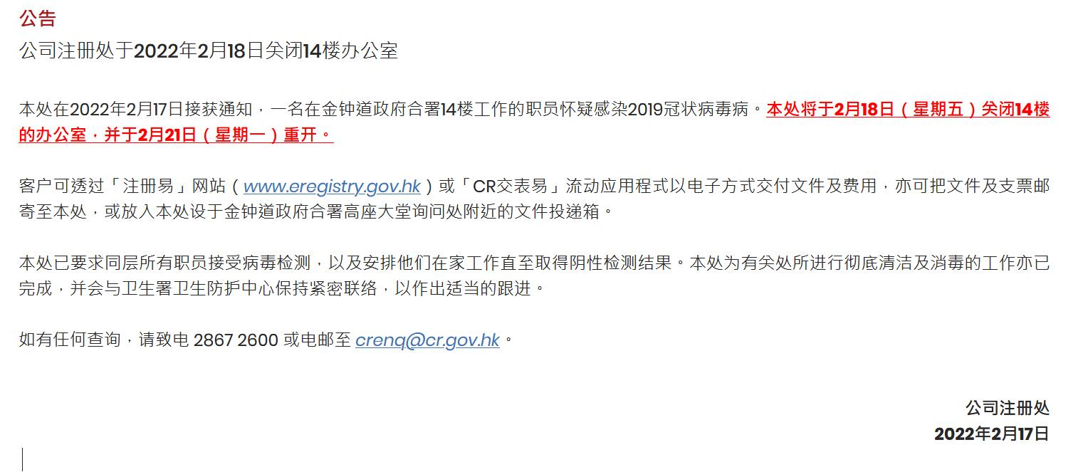 受疫情影響,香港公司注冊(cè)處今日起關(guān)閉14樓辦公室,18日重開(kāi)。