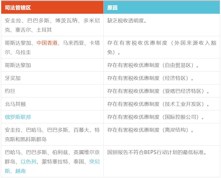 相比“黑名單”的一成不變,修訂后的歐盟稅收不合作轄區(qū)“灰名單”中共有25個司法管轄區(qū),其中4個是新增加的司法管轄區(qū),分別是:俄羅斯、以色列、越南和突尼斯。其中,俄羅斯被列入“灰名單”的原因是存在有害稅收優(yōu)惠制度(國際控股公司),而以色列、突尼斯和越南,則主要是在國別報告中不符合BEPS行動的最低標準。
