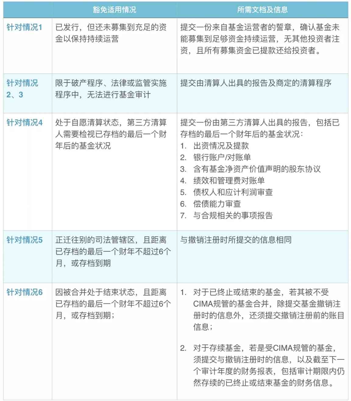 針對上面六種情況,我們?yōu)槟沓鏊杼峤坏牟煌臋n、信息及費用詳情如下表,供您參考:除了上述特定的所需文檔及信息外,申請審計豁免時還需要提交誓章,并繳納相應費用。CIMA會根據(jù)基金實際情況來判斷是否予以豁免。