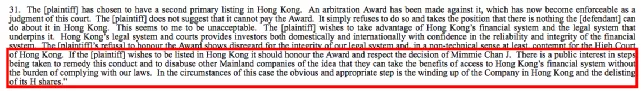 但是,夏利士法官指出,HKK2可通過清盤命令或任命清盤人所產(chǎn)生的“杠桿效應(yīng)”而受益。清盤人所采取的強制執(zhí)行行動,對晨鳴紙業(yè)的名譽及海外業(yè)務(wù)的經(jīng)營能力都會有十分巨大的負(fù)面影響。除非晨鳴紙業(yè)毫不在乎清盤令對其帶來的不利影響,否則該公司將會在別無選擇的情況下支付仲裁裁決的判定債項。