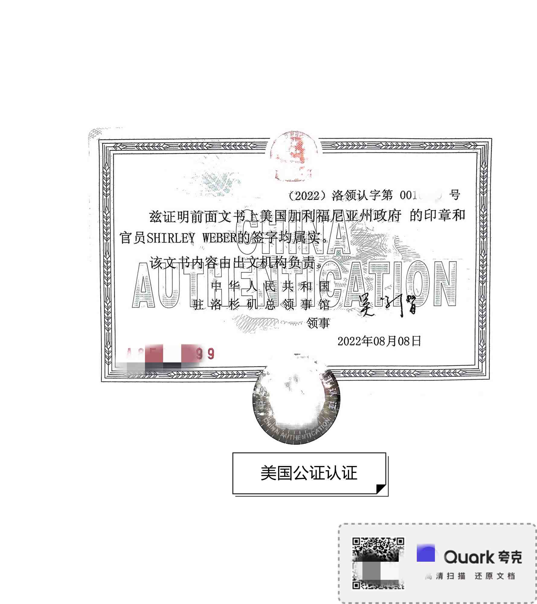 4、認證流程:先由美國當?shù)氐膰H公證律師進行公證,公證好的文件送往美國州務卿認證,送往中國駐美國使領館認證,并在規(guī)定的時間內前往取件