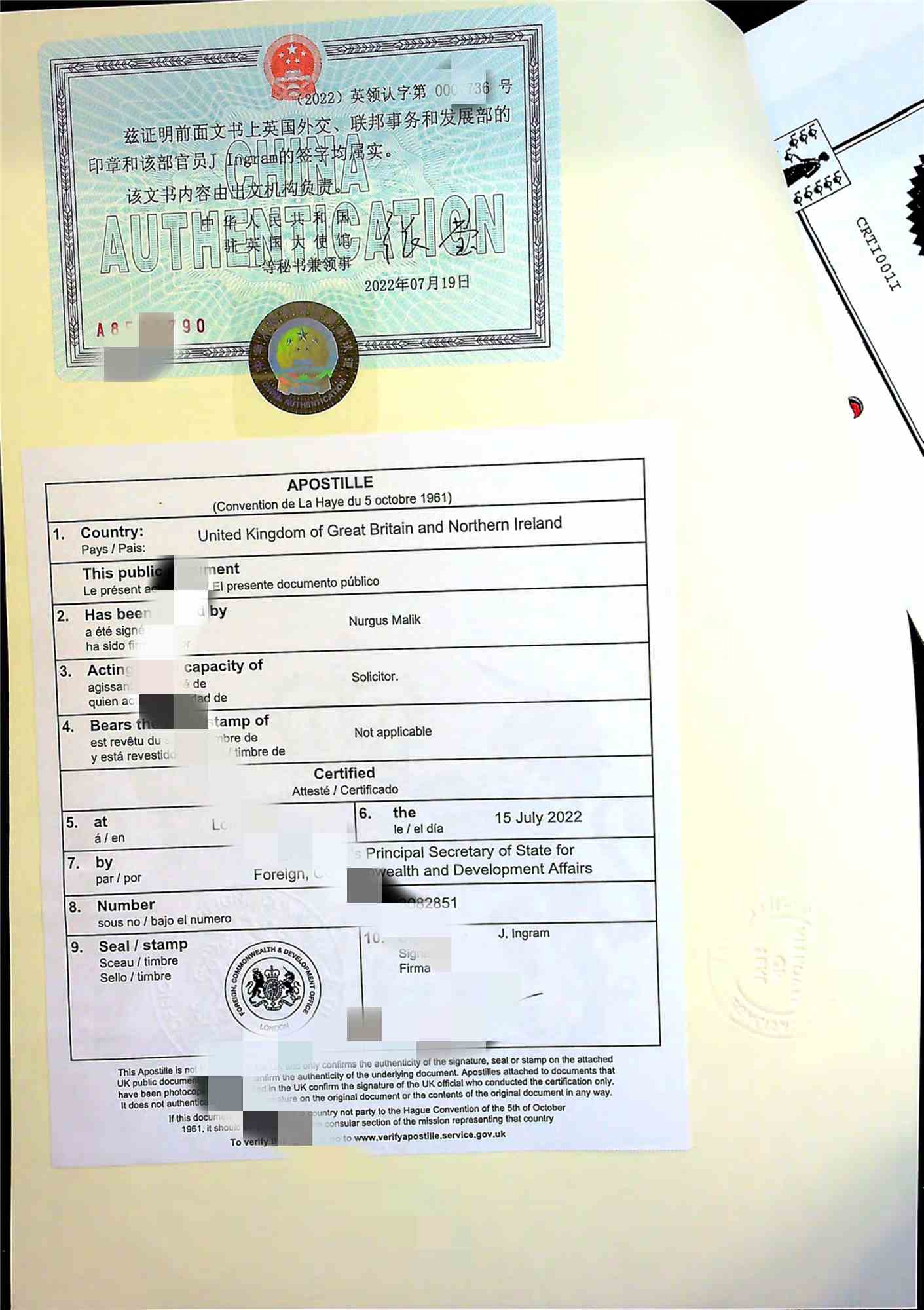 英國公證員公證,英國外交部認證,中國駐英國使領館認證。